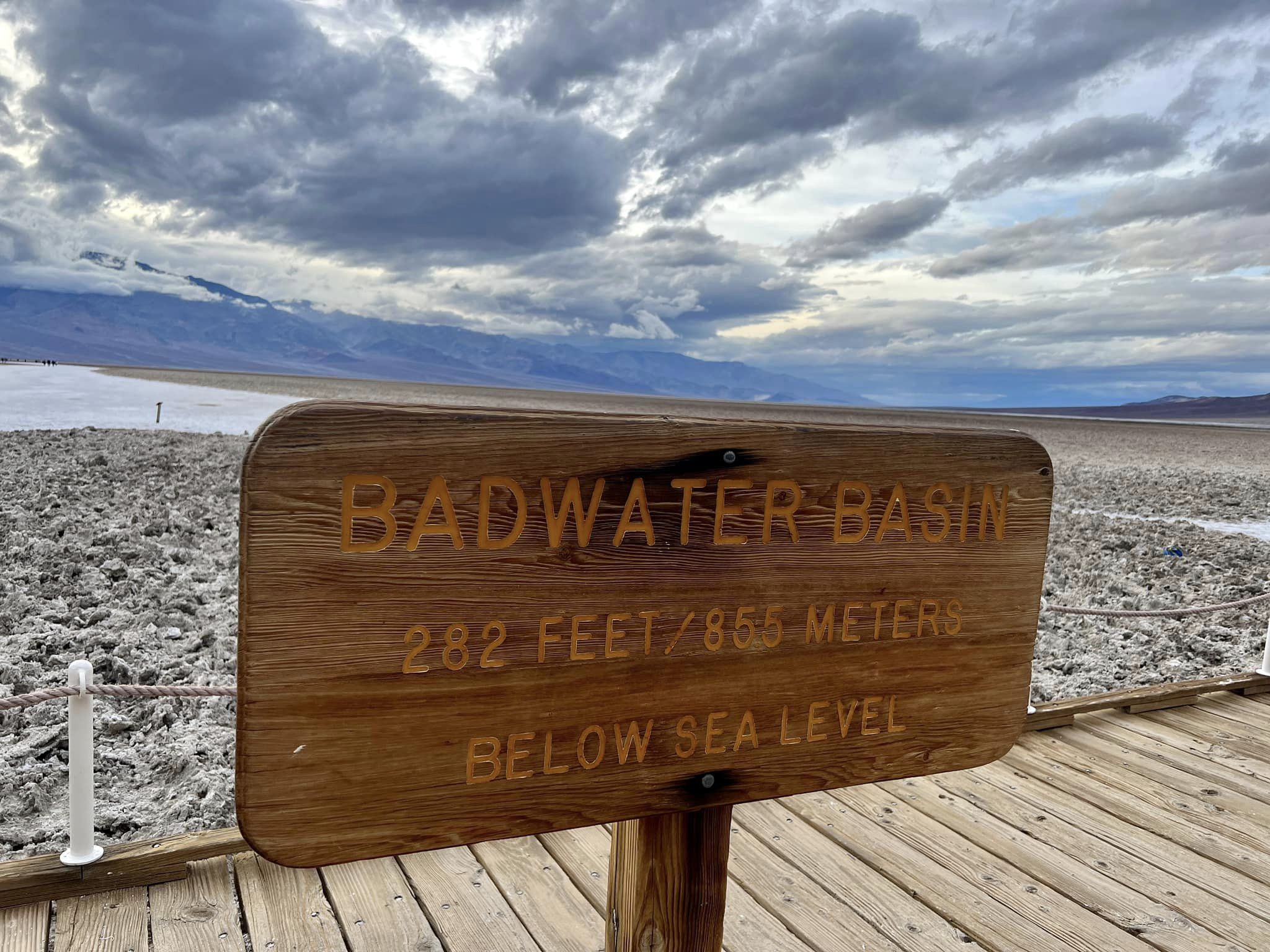 - Badwater Basin is located about 86 meters below sea level (282 feet), is the lowest point in the United States, as well as North America. From the parking lot, you follow a path to the salt flats. To see the beautiful salt polygons, you need to hike about 1.5-2 miles out to the salt flats. Note that on the way to the salt flat, there are some parts that are a bit slippery. Because there’s nothing around to shield, if it’s hot, then it’s incredibly hot; and when windy, it feels as though the wind can blow you away – that’s the situation on the afternoon when we visited! From the parking lot, the walk to the salt flat is less than 1 mile. This can be a very unique place to take photos.