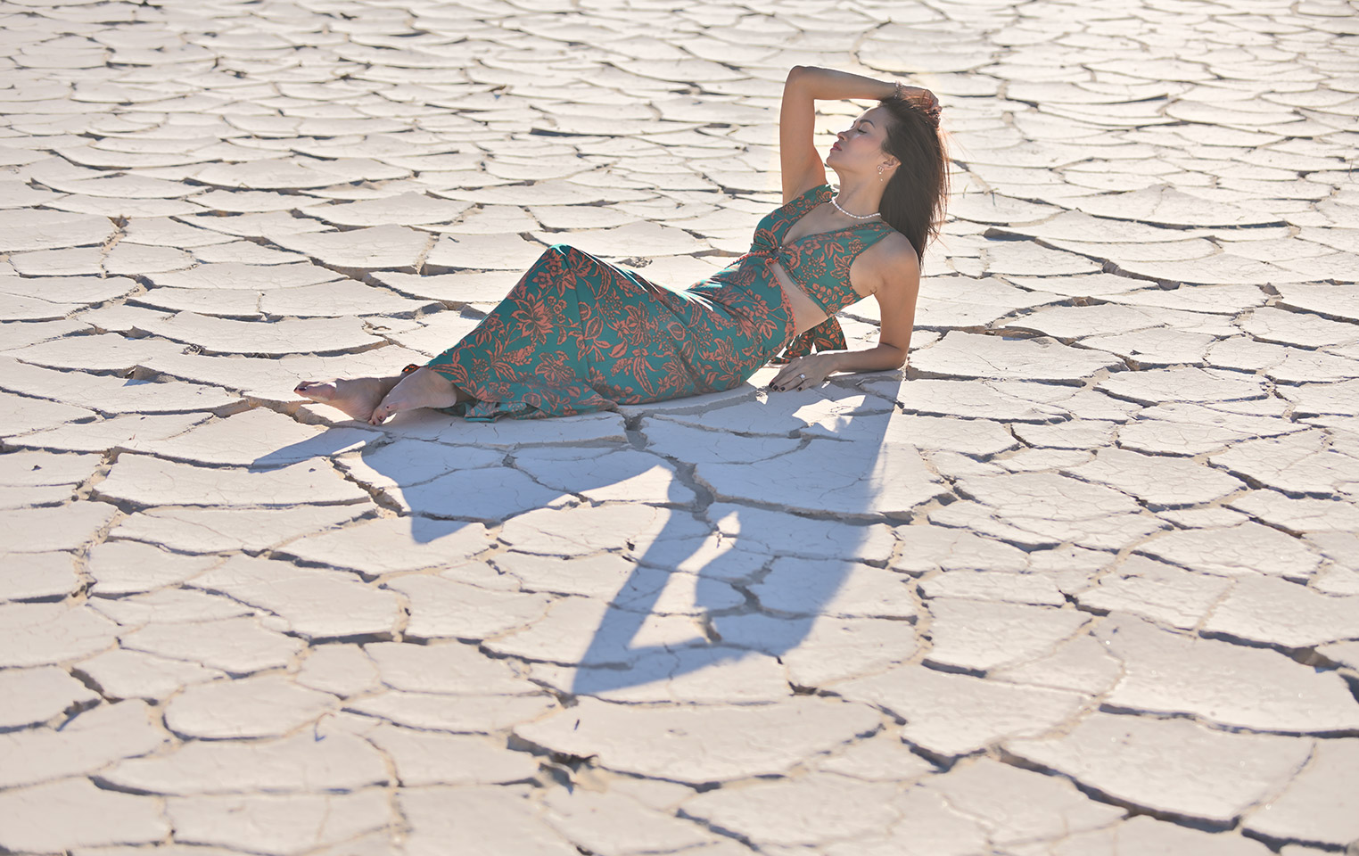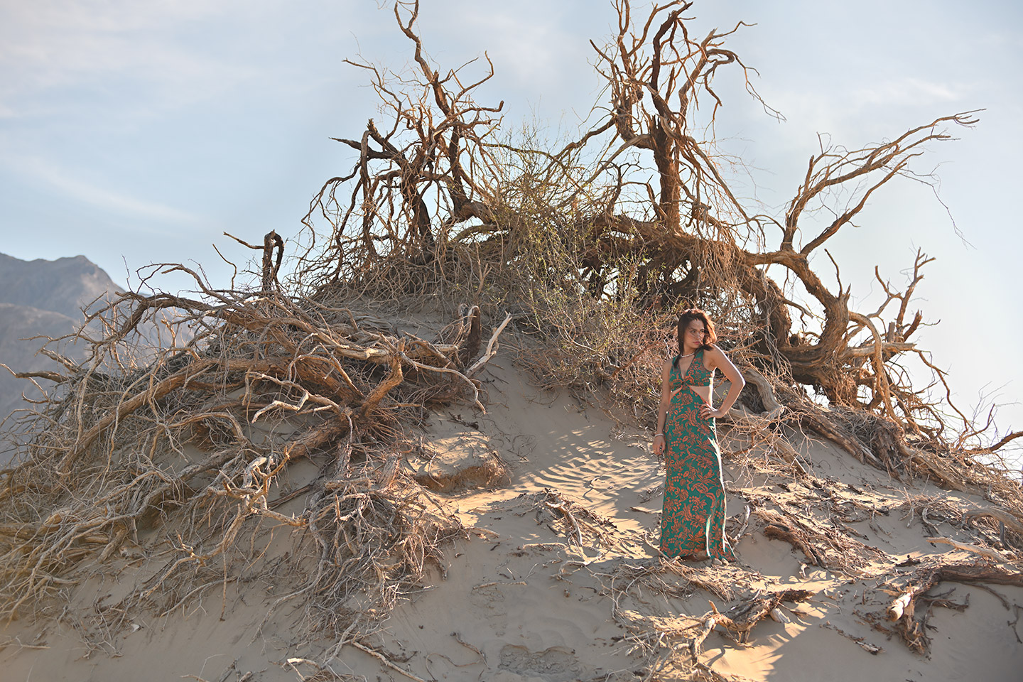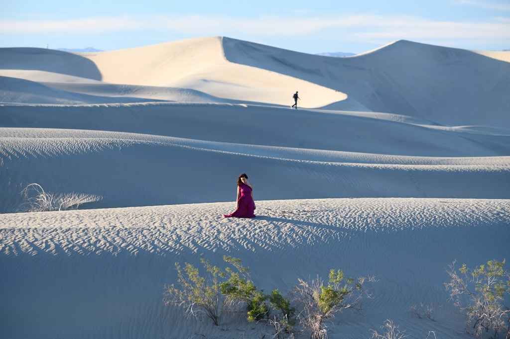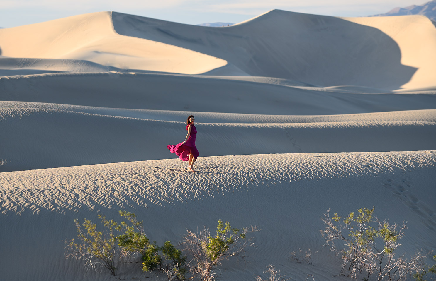 As you have seen scattered throughout this article, the landscapes in Death Valley are stunning and unique. With such a beautiful background, taking photo of people here is also very ideal. Regarding outfit colors, I find any contrasting color would work. As I said, I saw a couple taking wedding photos here where the groom wore a black suit and the bride wore a white dress, but still looking very beautiful. With unique landscapes, you can take photos with many different concepts: edgy or graceful (like the bride). I’m loyal to dresses, so we tried the concept of “rough elegance”.