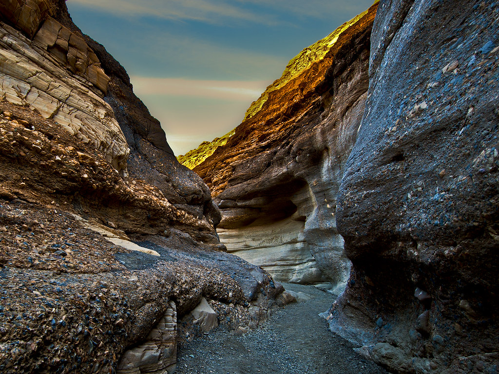 - Mosaic Canyon is located in the Stovepipe Wells area. To get here, you have to drive about 2 miles on gravel (unpaved) roads to the trailhead. Therefore, sedans, SUVs, trucks are recommended. Larger vehicles such as buses or RVs are not allowed. From the trailhead, you have to hike about 4 miles. The trail is uneven and considered to be difficult, and has many interesting nooks and crannies. You should plan about 3 hours to hike.