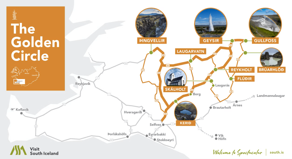 The most famous scenic route in Iceland is easy to do from Reykjavík. It is an efficient way to see the most famous attractions in the southwestern part of the country. The route is approximately 250 km roundtrip from Reykjavík. Most popular sites include Gullfoss, Geysir, and Thingvellir National Park.