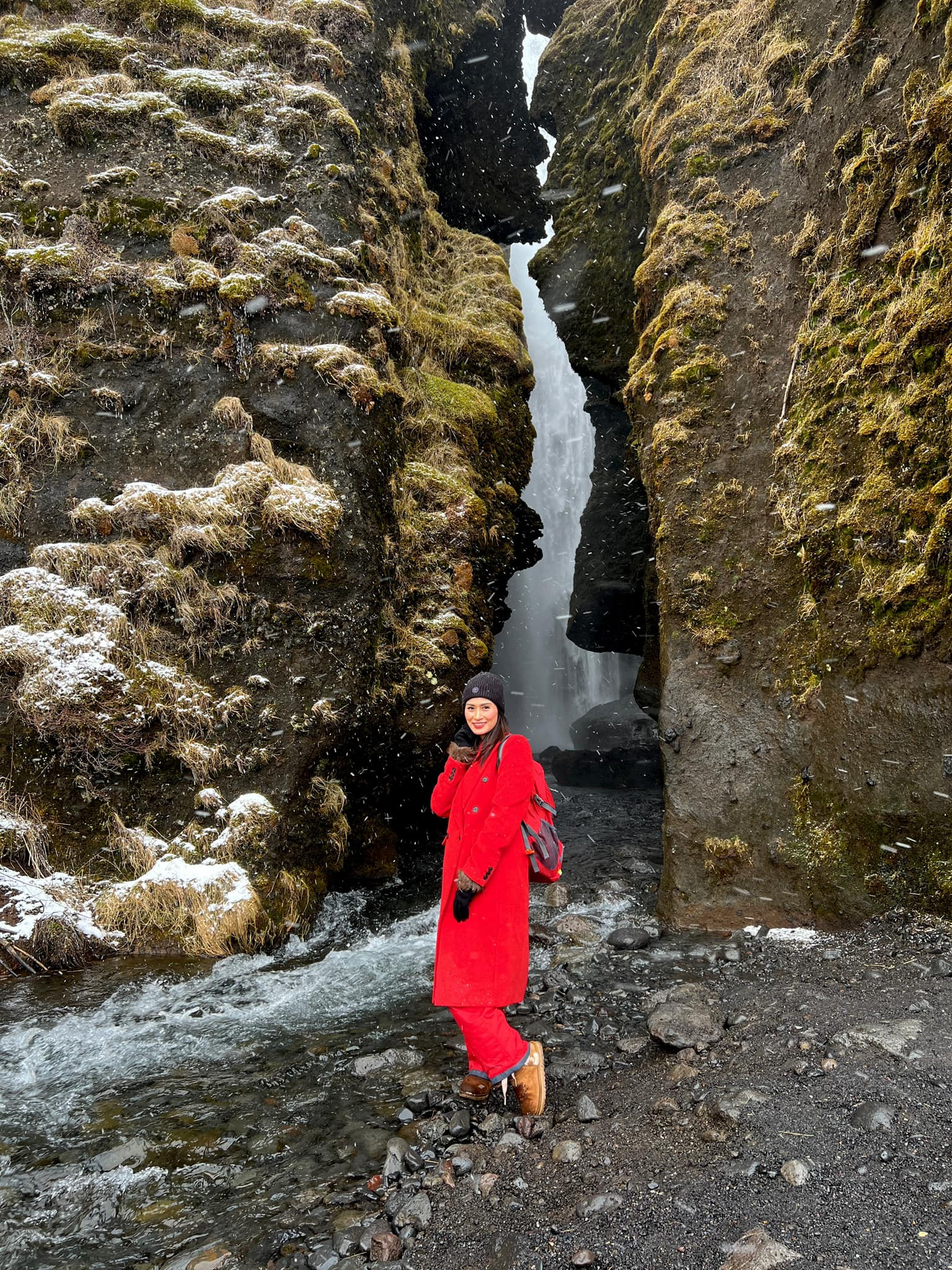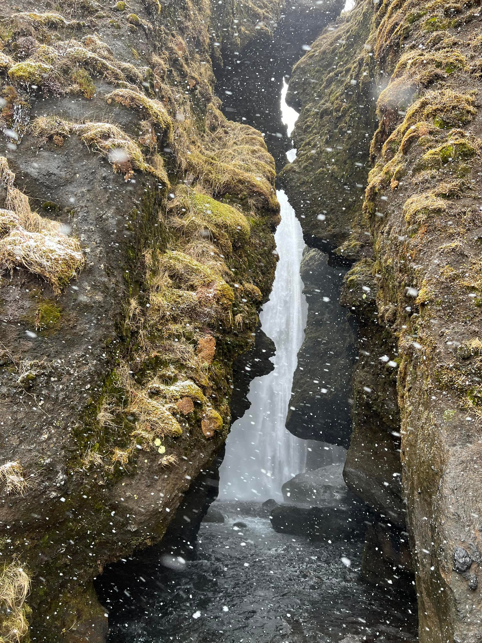 Gljúfrafoss is a small waterfall north of Seljalandsfoss, hidden behind a narrow slot canyon. If you’re not afraid to get wet, you can walk close to the fall behind the canyons. As seen in the photos, it was snowing (almost like hail) and extremely windy, so dress properly, and ensure you have a change of clothes since you’re likely to be wet.