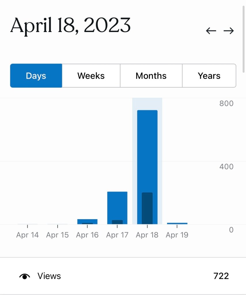 Ngày đầu tiên mình ra mắt blog. Vì khách xem blog đến từ các múi giờ khác nhau nên lượng truy cập được chia ra trong 2 ngày. Vì mình không có bài đăng thường xuyên nên việc có khoảng trống về lượng khách truy cập giữa các bài đăng là điều dễ hiểu. Nhưng mình coi đây như một sự khích lệ. Blog của mình vẫn không xuất hiện trong công cụ tìm kiếm (không tự động xuất hiện, đặc biệt khi không có gói hosting cao cấp), và đó là mục tiêu mình dự định thực hiện.