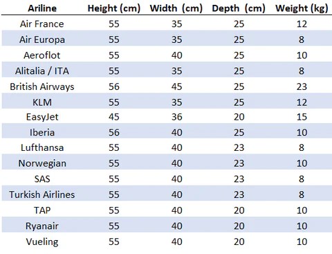 Các hãng hàng không chi phí thấp ở Châu Âu cho phép hành lý xách tay có trọng lượng từ 8 đến 15 kg. Lưu ý rằng các máy bay nhỏ hơn thường hàm ý trọng lượng cho phép thấp hơn trong phạm vi trên. Dưới đây là kích thước và trọng lượng của hành lý xách tay của hầu hết các hãng hàng không châu Âu.