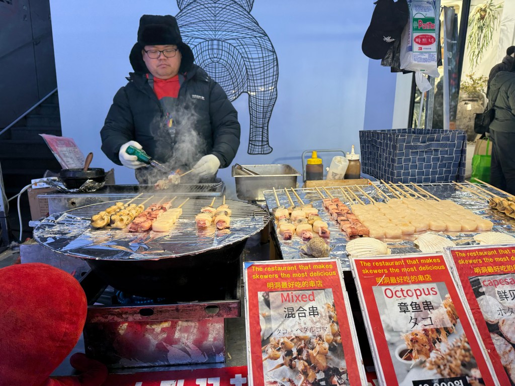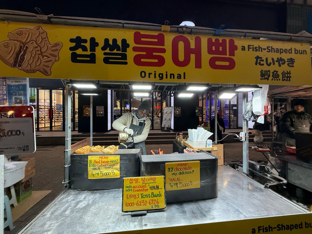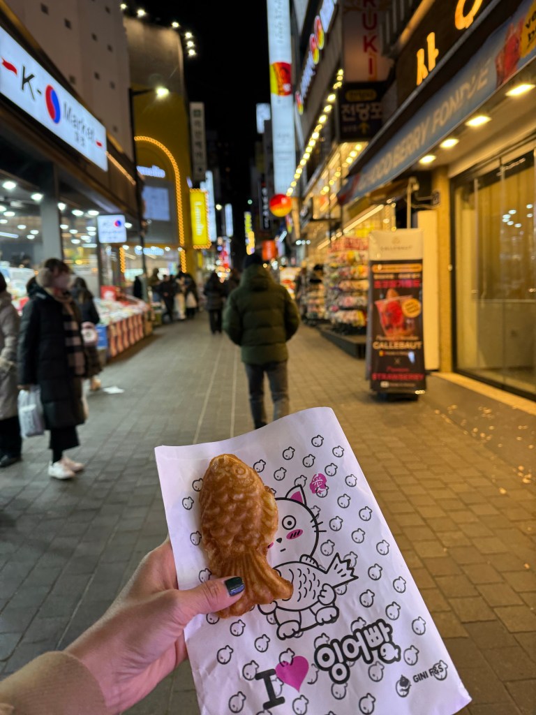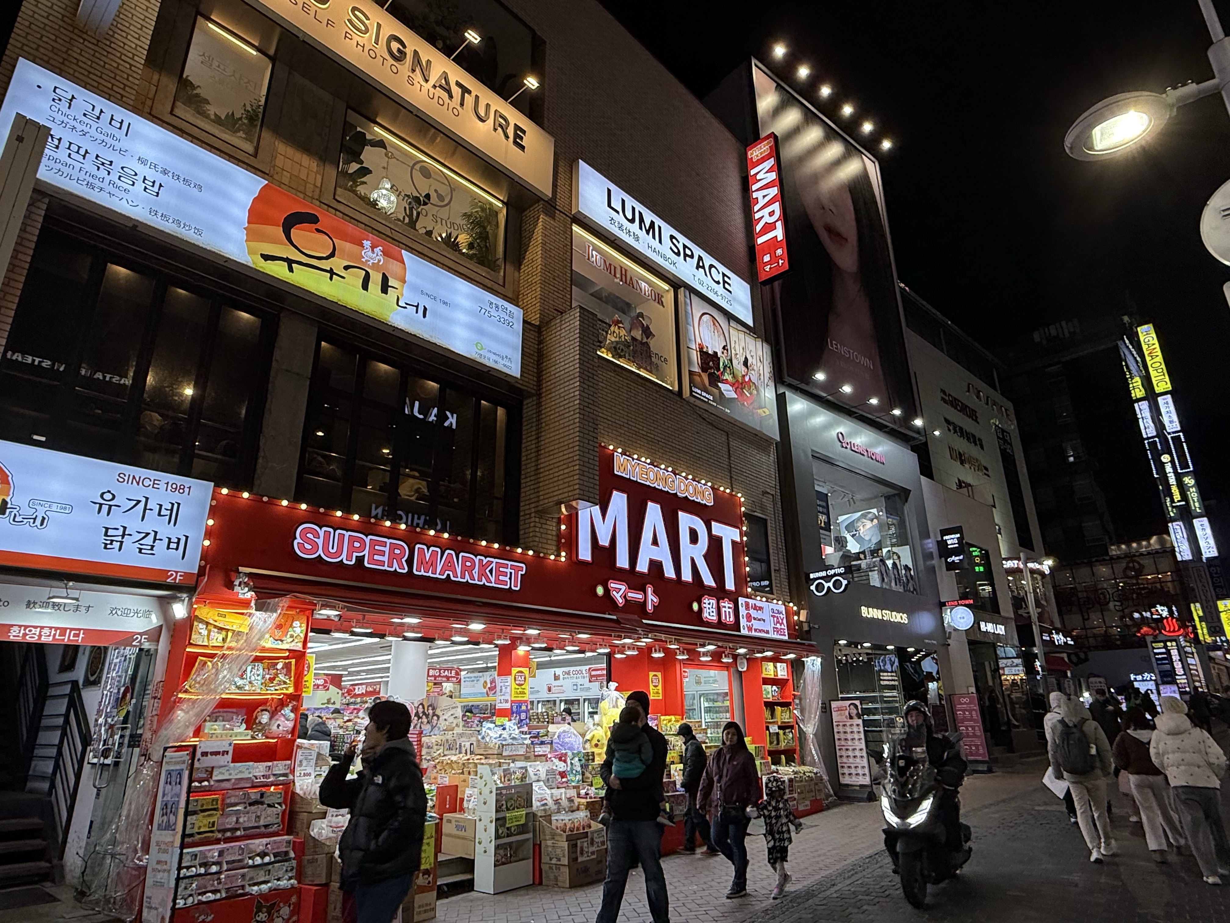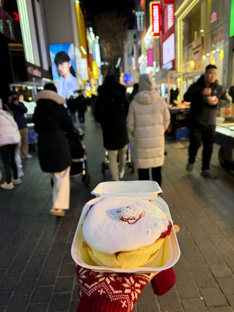 Chia sẻ nhỏ cho các tín đồ phim Hàn: dạo quanh khu Myeongdong, chúng mình cũng thấy những cửa hàng tạp hóa có bàn ghế để cạnh bức tường kính, nơi bạn có thể ngồi ăn mì ly và nhìn ra ngoài phố – giống như cảnh mà bạn thường thấy trong phim truyền hình Hàn Quốc! Chúng mình không ăn mì ly ở tiệm, nhưng đã mua một vài ly mì vị Hàn Quốc để ăn khuya tại khách sạn. Sau vài giờ lang thang trên phố trong cái rét cóng, chúng mình không thể chịu đựng được nữa và quyết định quay trở lại căn phòng ấm áp để thưởng thức mì ly nóng cho ấm bụng!! Thời tiết tháng 1 ở Seoul lạnh cóng luôn!!